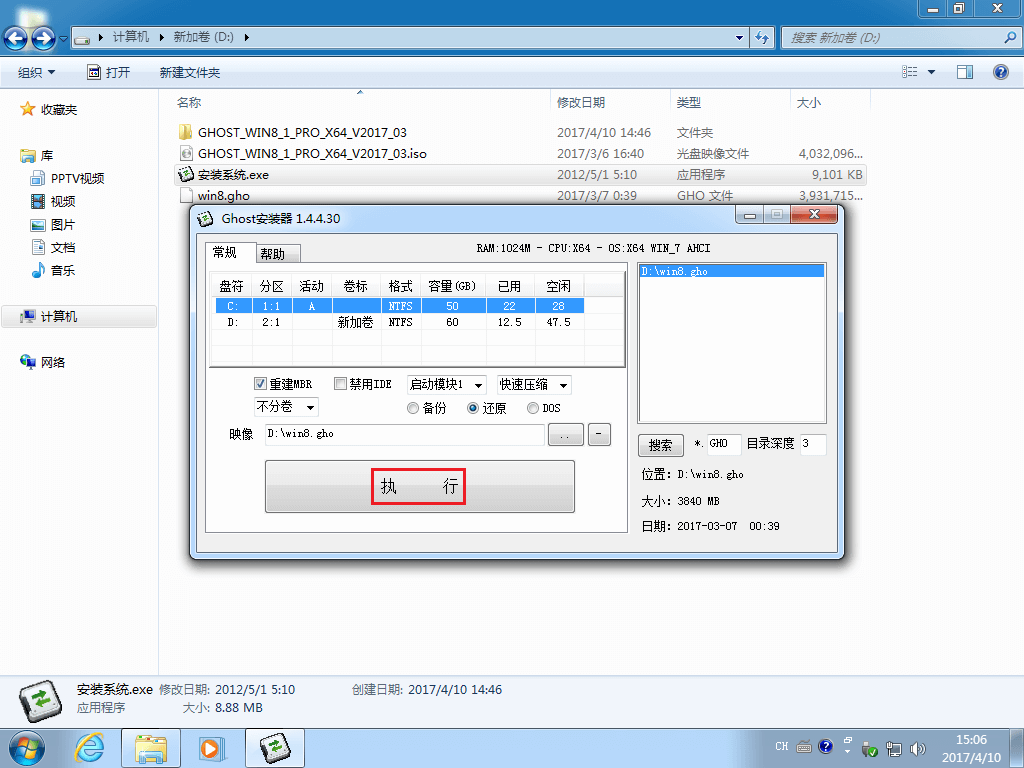 3、双击“安装系统”,选择“C盘”(默认C盘为系统磁盘),点击执行,如图所示:
