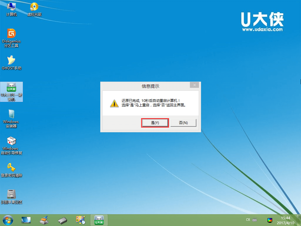 6)等待解压GHO文件的进度条完毕后会自动弹出是否重启电脑的窗口,我们现在只要点击"是(Y)"按钮即可,然后它就会自动重启电脑,重启的时候我们 把U盘从USB插口处拔出来,最后电脑将会自动安装系统,直到进入电脑桌面为止那就表示ghost Windows Win8系统安装完毕了,如下图: